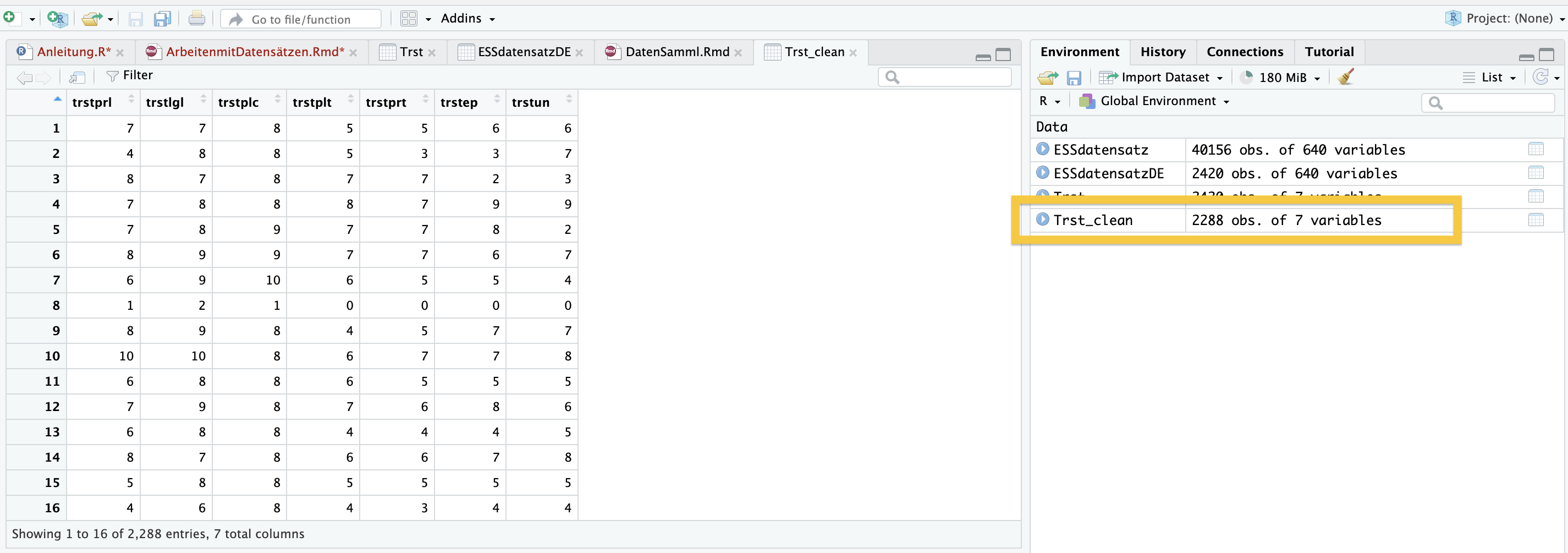 Wahrscheinlich wirst du bei der Analyse Stichproben ziehen, mit der Grundgesamtheit arbeiten ist oft für Seminarkontexte zu viel und generell nicht besonders sinnvoll. Um zu vermeiden, dass du Stichproben ziehst, die NA Werte haben, kannst du eine Variable erstellen, die von solchen Werten befreit ist. Am besten gibst du ihr einen Namen, an dem du erkennen kannst, dass sich die „gesäuberten“ Werte darin befinden. Deswegen nenne ich sie jetzt „Trst_clean“.